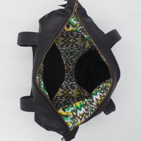 Extérieur en cuir noir et intérieur imprimé ethnique vert jaune et blanc.